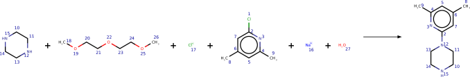 Reaction SMILES strings tin can be split into three parts — reactants, reagents, and products. The reactant molecules are those which are consumed during the course of the chemical reaction to grade the product, while the reagents are any boosted molecules which provide context nether which the reaction occurs (for example, catalysts), but do not explicitly take role in the reaction itself; an case of a reagent is shown in Figure1.