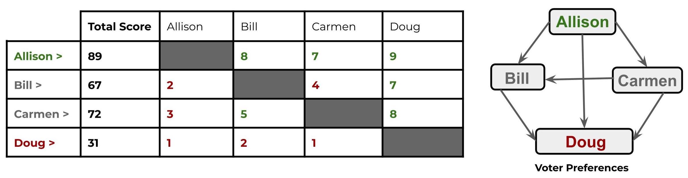 In the runoff, nosotros discover that Allison and Bill are both preferred by the aforementioned number of voters, (5 each,) but looking at the scores we discover that Allison was scored higher overall and then this is another simple tie that tin be easily resolved. Allison wins the election.
